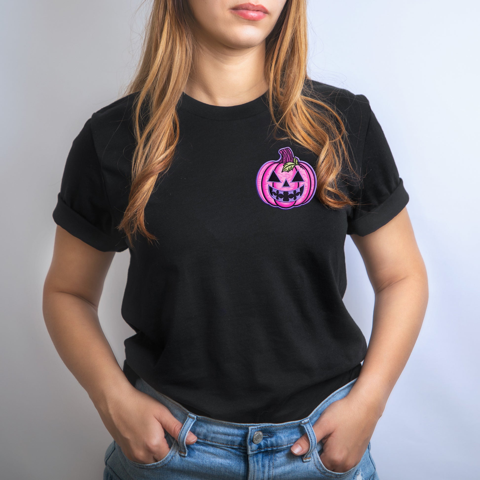 This adorable Faux embroidery pumpkin in pink or orange is so cute as a pocket design. Get your fall tees ordered and be ready when that first leaf falls! Prink measures approximately 3.5 inches by 3.5 inches.