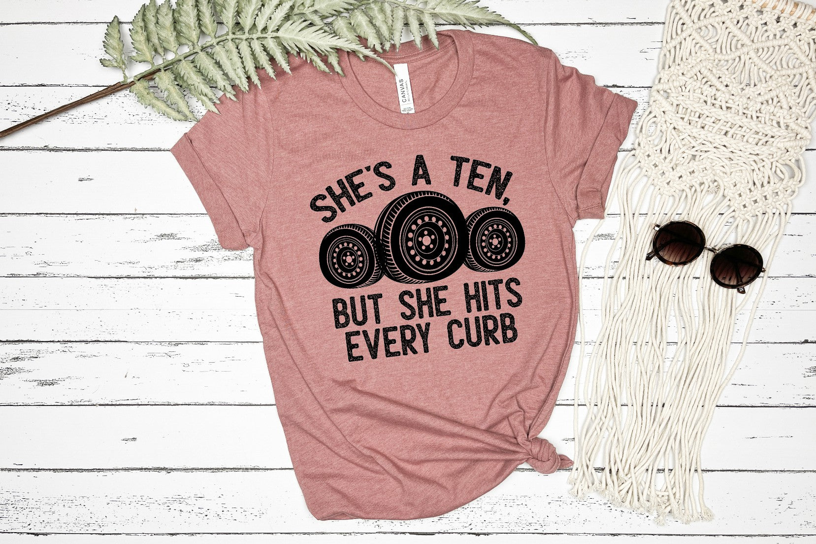 This She's a 10 but she hits every curb Tee is an absolute 10! It's big on comfort, with optional oversized Comfort Color Brand Tee sizing—up1 to 2 full sizes— and featuring a funny saying that’s sure to get some chuckles. Keep your style and your humor dialed up to 10!